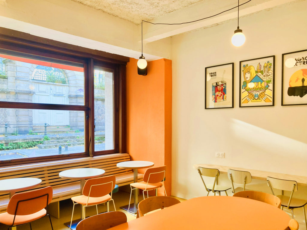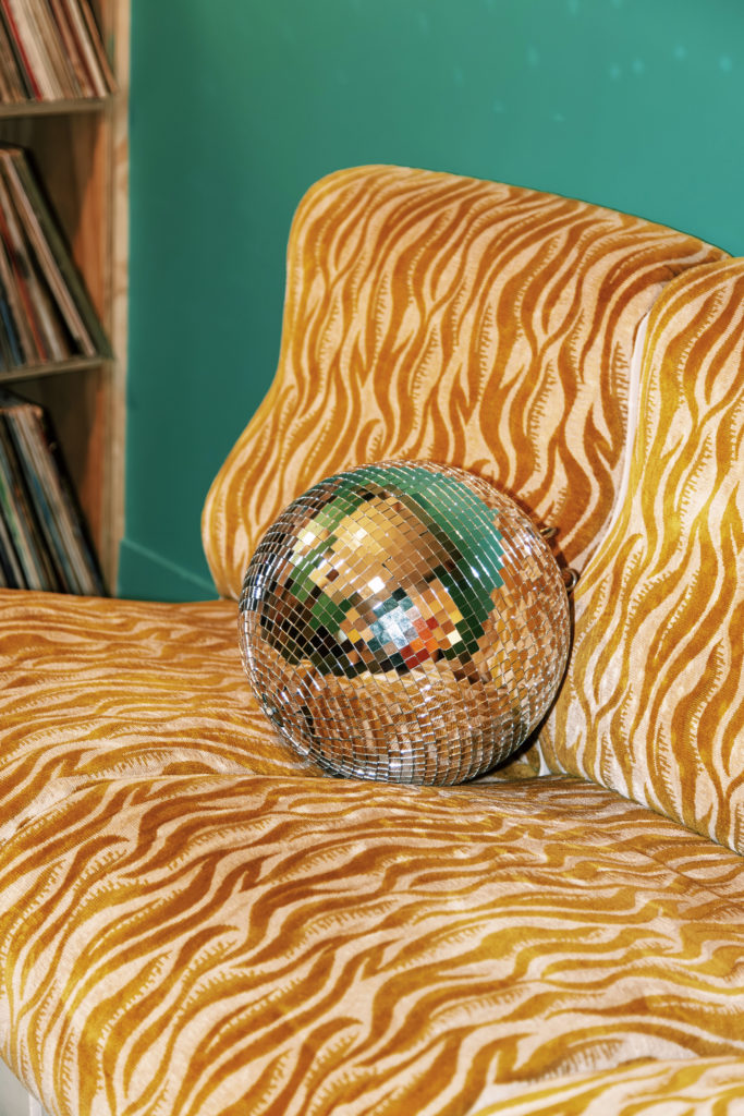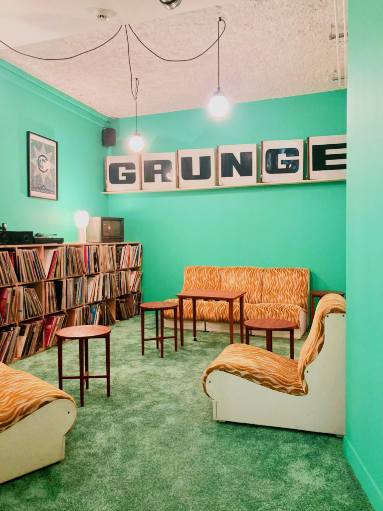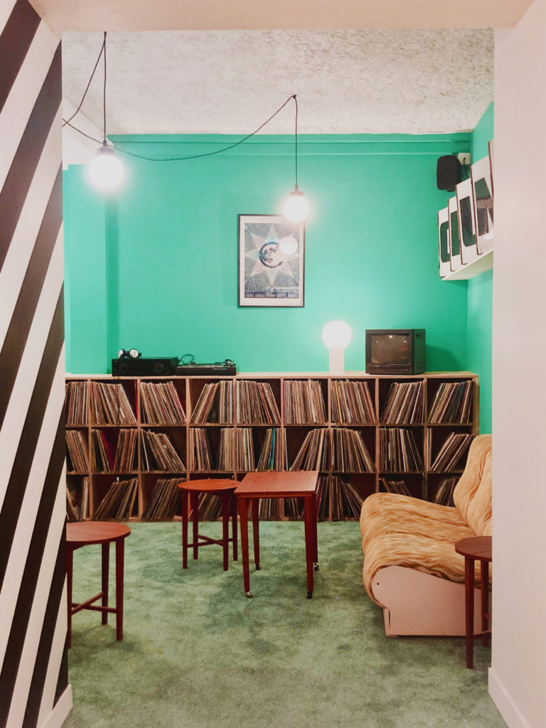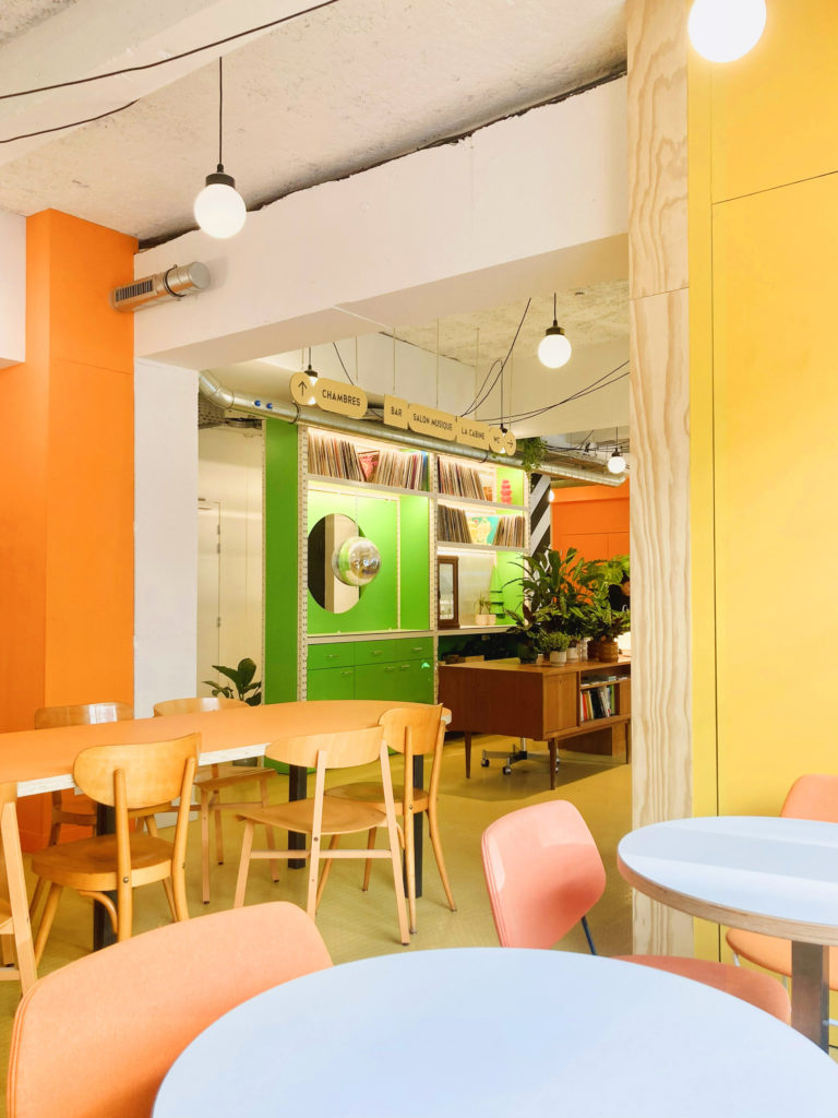 Pour le reste c’est 100% assemblage, bricole et réemploi. Un bar composé d’étagères industrielles pluguées à d’anciens buffets, commodes et vitrines. Du mobilier chiné, pimpé et augmenté, de grandes banquettes de gare, un canapé 70’s zèbré, affiches et sérigraphies de concerts mythiques collées aux murs, boules à facettes de seconde main provenant d’anciennes discothèques.
