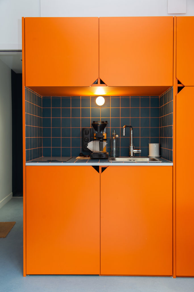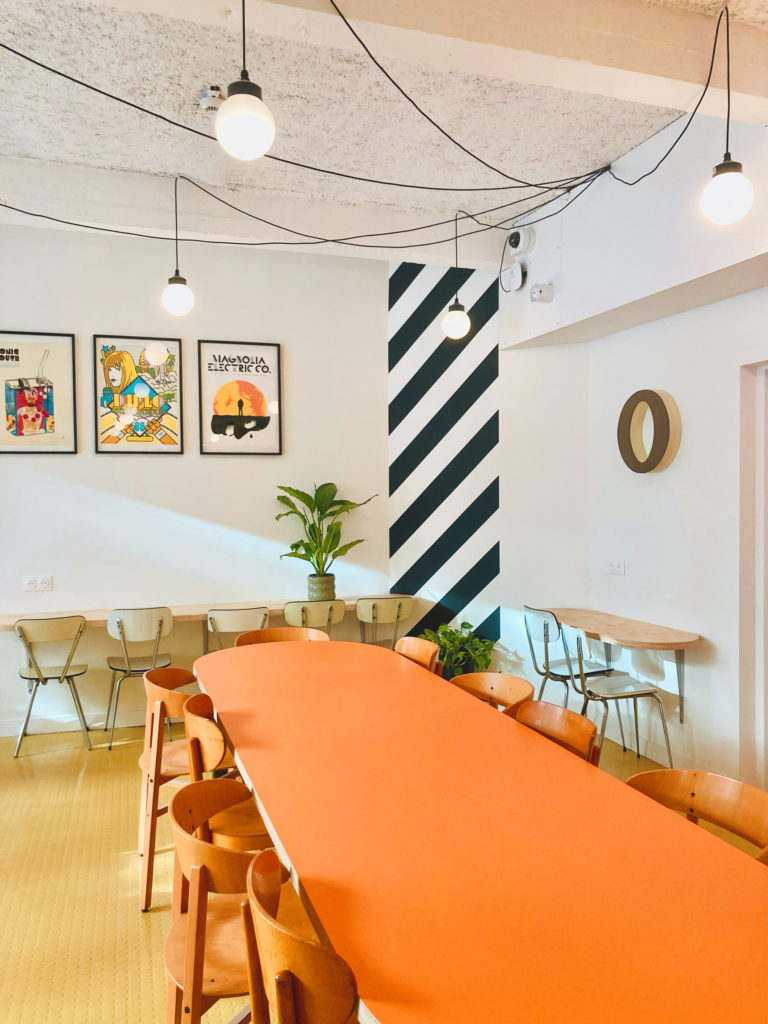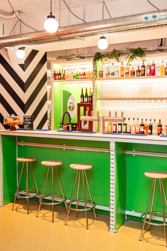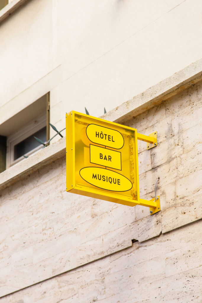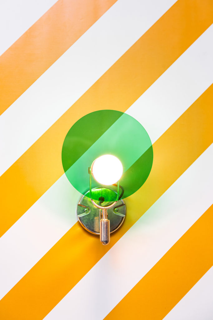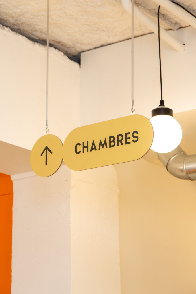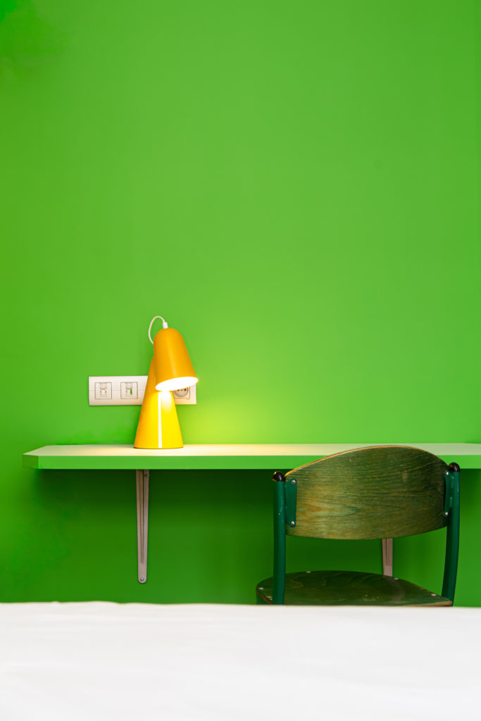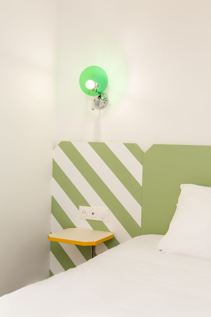 Pas de déco à thème pour les chambres, ne reste qu’un fond vert de cinéma ou chacun peut s’imaginer, retoucher et instagrammer son propre univers. La tête de lit enveloppe les dormeurs de ses zébras ferroviaires sous la lumière des anciennes appliques de l’hôtel pimpées au plexiglass comme de grands phares de locomotive.