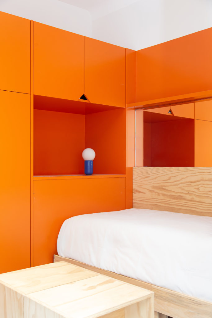 Pas de déco à thème pour les chambres, ne reste qu’un fond vert de cinéma ou chacun peut s’imaginer, retoucher et instagrammer son propre univers. La tête de lit enveloppe les dormeurs de ses zébras ferroviaires sous la lumière des anciennes appliques de l’hôtel pimpées au plexiglass comme de grands phares de locomotive.